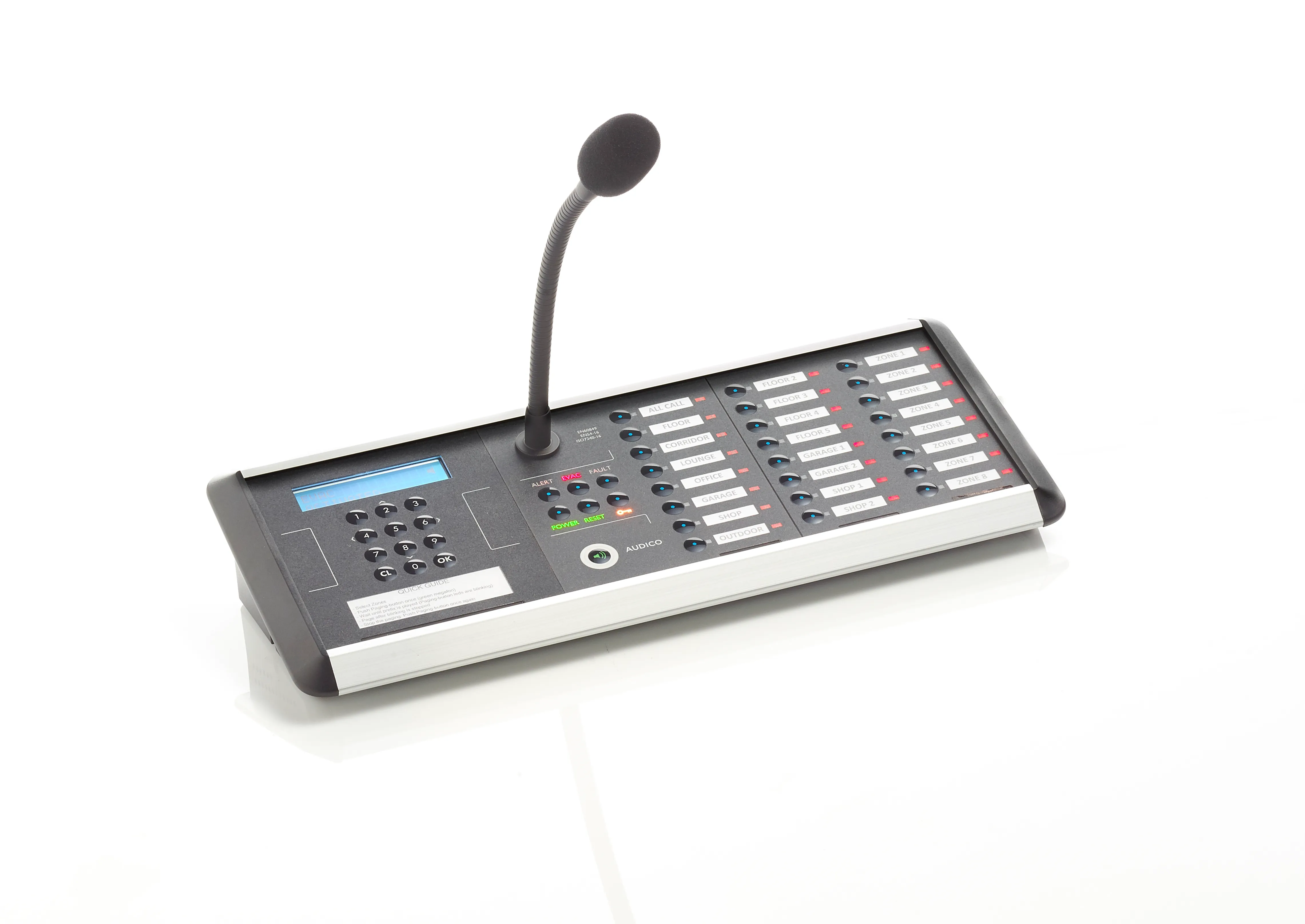 The AAE range of consoles are used to control diverse functions in the Audico Avec G3 sound system. The unit allows paging and playback of prerecorded messages in different zones within a building. The console with an LCD display (DC) can be used to activate program sources and adjust volumes in different zones. The error monitoring required by the EN-standards is shown with indicator lights.